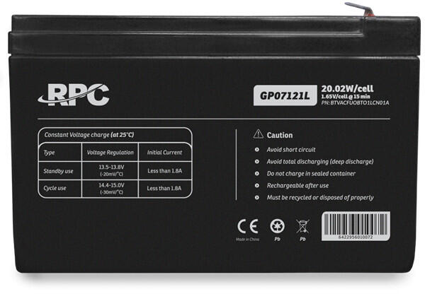 RPC Akkumulátor - GP07121L, zárt gondozásmentes GYÁRTÓ : NJOY Típus: VRLA AGM Volt: 12V Tervezett élettartam: Max. : 5 év Csatlakozó Típusa: T1, 4,8mm Tulajdonságok: Teljesen zárt, gondozásmentes Tömeg : 2,08 Kg