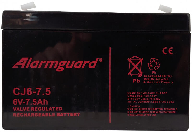 Alarmguard CJ6-7.5 6V 7,5Ah-s zártrendszerű, AGM technológiás, szeleppel vezérelt (VRLA), ismételten újratölthető gondozásmentes (zselés) ólomsavas akkumulátor. Szigetelt tömítéssel vízszintes, függőleges és oldalsó irányban is elhelyezhető így biztonságát és funkcióit ez nem befolyásolja. Várható élettartama 3-5 év (Standby - Készenléti üzemmódban 5 év), mely nagyban függ a környezeti hőmérséklettől, felhasználási területtől, terheléstől. Felhasználási terület: riasztó és tűzvédelmi rendszerek, tápegységek, etetőhajók, gyerekjátékok, lámpák ... stb.