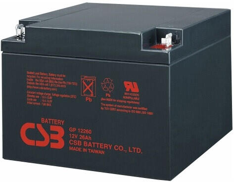 12V 26Ah CSB GP 12260 AGM technológiás, szeleppel vezérelt (VRLA) zártrendszerű gondozásmentes (zselés) ólomsavas akkumulátor. A CSB márka egy modern, csúcstechnológiájú energiatároló akkumulátor általános célú használatra mely ismételten újratölthető. Szigetelt tömítéssel vízszintes, függőleges és oldalsó irányban is elhelyezhető, biztonságát és funkcióit ez nem befolyásolja. Várható élettartama 3-5 év (Standby - Készenléti üzemmódban 5 év, 25 ⁰C), mely nagyban függ a környezeti hőmérséklettől,