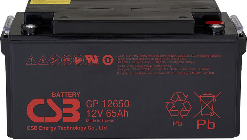 12V 65Ah CSB GP 12650 AGM technológiás, szeleppel vezérelt (VRLA) zártrendszerű gondozásmentes (zselés) ólomsavas akkumulátor. A CSB márka egy modern, csúcstechnológiájú energiatároló akkumulátor általános célú használatra mely ismételten újratölthető. Szigetelt tömítéssel vízszintes, függőleges és oldalsó irányban is elhelyezhető, biztonságát és funkcióit ez nem befolyásolja. Várható élettartama 3-5 év (Standby - Készenléti üzemmódban 5 év, 25 ⁰C), mely nagyban függ a környezeti hőmérséklettől,