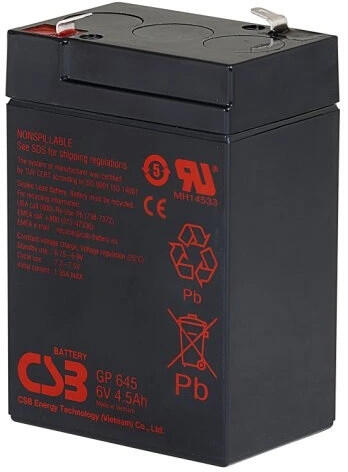 GP645 6V 4,58Ah - tartalék áramforrás, gondozásmentes, VRLA, teljesen zárt CSB márkájú zselés akkumulátor . AGM technológia. Szünetmentesekhez, riasztókhoz, tűzvédelmi eszközökhöz. A GP sorozatú CSB akkumulátorokat a legszélesebb körű alkalmazásokhoz tervezték. A GP645 akkumulátorok 260 kisütési ciklusig (100%-s kisütési mélység esetén) , vagy akár 5 évig "készenléti" (Stand-by) üzemmódban használhatóak . A CSB akkumulátorok karbantartást nem igényelnek , teljesen zártak és bármilyen helyzetben működnek.