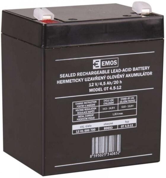 EMOS 12V 4,5Ah OT 4.5-12 B9653 zselés karbantartásmentes riasztó vagy szünetmentes T1-es csatlakozású akkumulátor. Felhasználási területek: EZS (elektronikus biztonsági rendszerek) EPS (elektronikus tűzvédelmi rendszerek) UPS (szünetmentes tápegység) tartalék akkumulátor liftekhez - világításhoz, híváshoz -, horgászoknak halradarokba, csónakmotorok táplálására. Optimális élettartam kb. 5 év