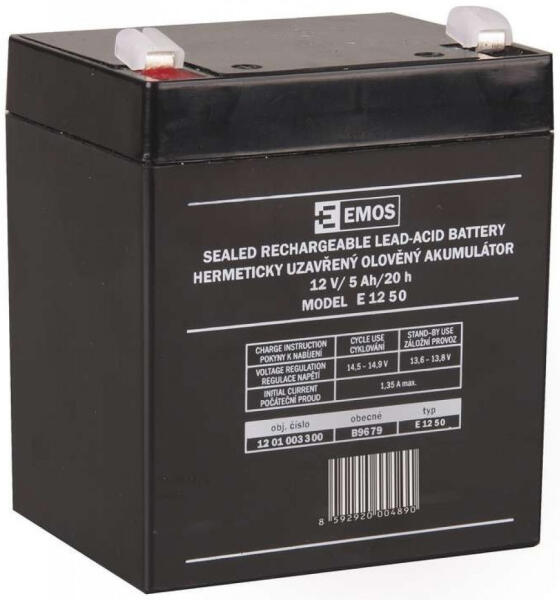 EMOS 12V 5Ah B9679 zselés karbantartásmentes riasztó vagy szünetmentes T2-es széles sarus csatlakozású akkumulátor. Súly 1,65 kg Felhasználási területek: EZS (elektronikus biztonsági rendszerek) EPS (elektronikus tűzvédelmi rendszerek) UPS (szünetmentes tápegység) tartalék akkumulátor liftekhez - világításhoz, híváshoz -, horgászoknak halradarokba, csónakmotorok táplálására. Optimális élettartam kb. 3-5 év