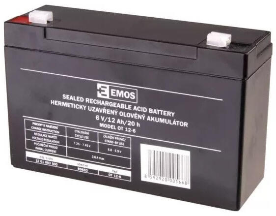 EMOS B9682 6V 12Ah AGM (Absorbent Glass Mat) technológiával gyártott karbantartás mentes ólomsavas zselés akkumulátor. Kiváló minőség és megbízhatóság a jellemzője. Az ólomlemezek és elektrolit megbízható tápellátást biztosítanak a legtöbb feszültségtámogatási rendszernek, például az UPS-nek vagy a vészhelyzeti áramellátásnak. Rendkívül erős teljesítmény-visszanyerő tulajdonság, alacsony önkisülési jellemző így számos pozícióba telepíthető mint pl. riasztórendszerek, távközlési berendezések, védelmi rendszerek, orvosi felszerelés... stb.