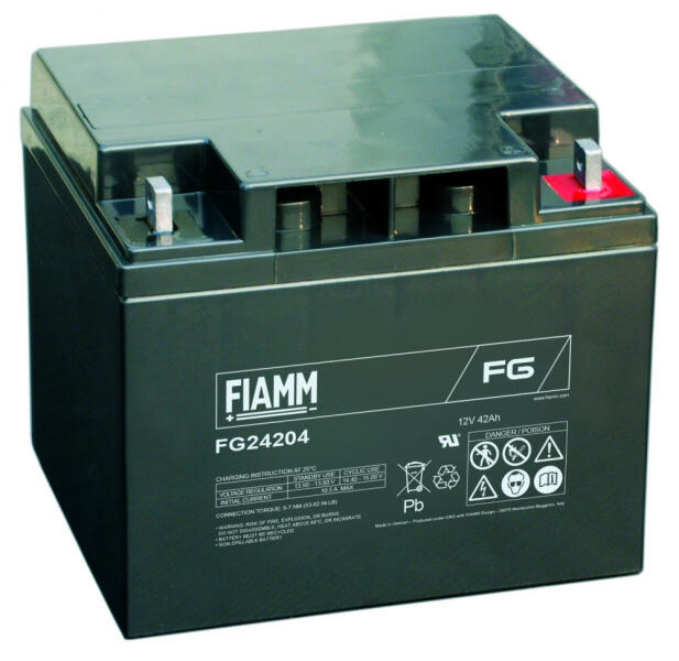 A Fiamm FG24204 12V 42Ah zárt, szivárgásmentes, felitatott elektrolitú, szeleppel vezérelt gázrekombinációs ólomsavas akkumulátor mely akár 1000 ciklus 20%-os kisütési mélységig kisüthető. Teljesen karbantartásmentes, 100%-ban újrahasznosítható 5 éves élettartamra tervezve. Felhasználási terület: szünetmentes (UPS) munka- áramforrás, riasztó- és tűzvédelmi rendszerek, gyerekjátékok, etetőhajók, lámpák, stb...