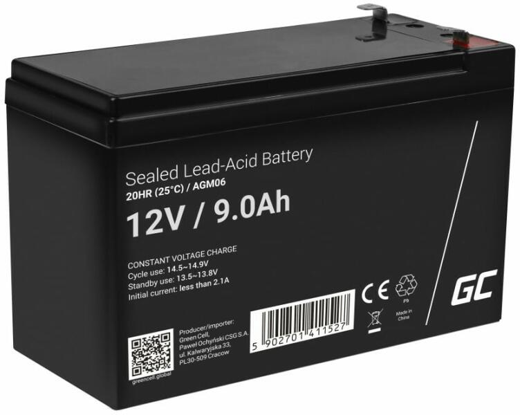 Akkumulátor / akkumulátor Green Cell AGM06 AGM 12V 9Ah 12V kapacitású akkumulátor minőségi anyagokból készült, AGM technológián alapulva, azaz olyan szerkezetben, amely üveggyapot -elválasztót tartalmaz, amely elnyeli az elektrolitot. Az AGM előnyei: karbantartásmentes működés, használat bármilyen helyzetben, ellenállás szélsőséges hőmérsékleteknek, a megújuló forrásokból származó energiához való csatlakozás lehetősége. Használat: riasztórendszerek, felügyeleti rendszerek, tűzvédelmi rendszerek, vészvilágítás, UPS -eszközök, napelemes rendszerek, elektromos játékok - feszültség: 12 V - kapacitás 9 Ah - terminál: Faston 250 (F2) - élettartam: több mint 5 év - méretek: 151 x 65 x 94 (98) mm