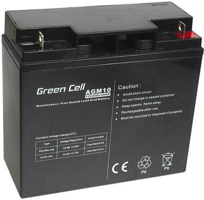 Green Cell AGM VRLA Maintenance-free AGM Battery AGM10 12V 20Ah (for lawnmower, boat, scooter, cart). What is an AGM battery? AGM is an energy storage battery with a wide range of commercial applications. Not only can we power toys and alarm systems with it, but it is also the heart of any UPS. Green Cell AGM batteries have a very wide range of applications. They can be used for both cyclic and buffer operation. Cyclic operation The cyclic use of a battery is to use it as a stand-alone power source. AGMs of this type are prepared for very frequent charging and discharging. Thus, they are used in wheelchairs, photovoltaic installations, golf carts, toys and lawnmowers. Buffer operation Buffer operation allows a battery to act as a backup power supply for a plugged-in device. A battery connected to a power system in the event of a failure of the main power source provides additional power. They are used in this way in alarm systems, UPS, cash registers or emergency lighting. Maintenance-free operation Batteries made with AGM technology were created to ensure the greatest possible safety during use. Thanks to the self-regulation function (VRLA valves), AGMs provide up to 5 years of maintenance-free operation. It increases the safety of the device's operation, regardless of the position of the battery. Safety AGM batteries are designed for even the most extreme conditions. The fiberglass used ensures that the electrolyte is sealed in the casing which allows the battery to be used in any position without fear of spilling the contents. This is especially important in the case of powered toys, which are exposed to various types of shocks. This makes Green Cell AGM batteries completely safe for users. Manufacturer. Green CellModel AGM10Capacity 20 AhVoltage12 VTypeVRLA AGMTerminal M5 screw (F3)Max. discharge current 3CCapacity by temperature (40 °C~102%) (25 °C~100%) (0 °C~85%) (-15 °C~65%)Cyclic charging 14.5 - 14.9 V (-30 mV/C)Maximum charging current 6.0 ALifetime more than 5 yearsSelf-discharge 2% per month (at 25°C)Buffer charging 13.5 - 13.8 V (-20 mV/C)Internal resistance ≤16.2m (at temp. 25°C)Capacity range 10 - 20 AhWeight 5.20 kgDimensions 181 x 77 x 167 mm