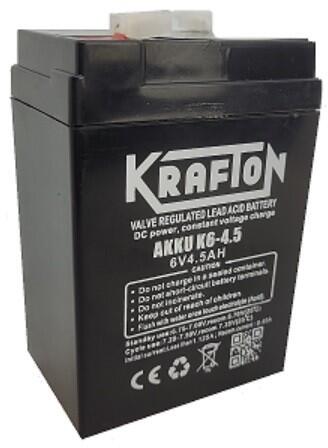Krafton K6-4.5 6V 4,5Ah VRLA technológiával gyártott karbantartás mentes ólomsavas zselés akkumulátor. Kiváló minőség és megbízhatóság a jellemzője. Az ólomlemezek és elektrolit megbízható tápellátást biztosítanak a legtöbb feszültségtámogatási rendszernek, például az UPS-nek vagy a vészhelyzeti áramellátásnak. Rendkívül erős teljesítmény-visszanyerő tulajdonság, alacsony önkisülési jellemző így számos pozícióba telepíthető mint pl. riasztórendszerek, távközlési berendezések, védelmi rendszerek, orvosi felszerelés... stb.