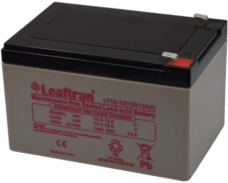 12V 12Ah Leaftron LT12-12 T2 AGM technológiás, szeleppel vezérelt (VRLA) zártrendszerű gondozásmentes (zselés) ólomsavas akkumulátor. A Leaftron márka egy megbízható energiatároló akkumulátor általános célú használatra mely ismételten újratölthető. Szigetelt tömítéssel vízszintes, függőleges és oldalsó irányban is elhelyezhető, biztonságát és funkcióit ez nem befolyásolja. Várható élettartama 3-5 év (Standby - Készenléti üzemmódban 5 év, 25 ⁰C), mely nagyban függ a környezeti hőmérséklettől, felhasználási területtől, terheléstől. Felhasználási terület: riasztó és tűzvédelmi rendszerek, tápegységek, etetőhajók, gyerekjátékok, lámpák ... stb.