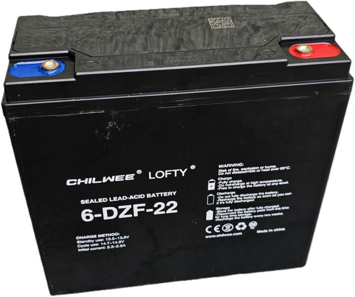 12V 23Ah CHILWEE LOFTY 6-DZF-22/6-DZF-20 vagy 6-DZM-20 elektromos kerékpárba ciklikus zselés akkumulátor csavaros csatlakozással. Méret:(H)181mm x (Sz)76mm x (M)167mm Súly:6.2kg Garancia 12 hónap + 12 hónap jótállási idő. Várható élettartam 5 év (20 órás kisütésnél, 25°C-on). Felhasználási terület: elektromos kerékpár, e-bike, elektromos meghajtású autó, golfkocsi, kerekesszék, rokkantkocsi, tricikli... stb.