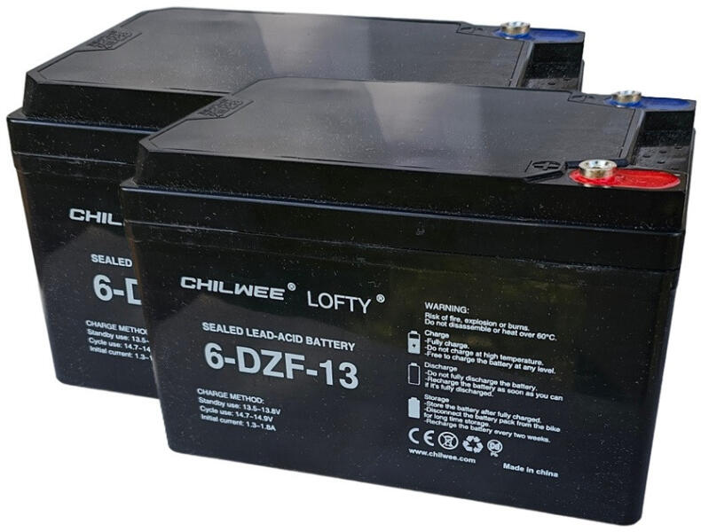 24V 13Ah CHILWEE LOFTY 6-DZF-13 (2db 12V 13Ah) típusjelölésű elektromos kerékpárba ciklikus zselés akkumulátor csavaros csatlakozási lehetőséggel. Méret: (H)151mm x (Sz)100,2mm x (M)100,4mm csavarral 104,6mm. Súly: 4,51kg/db. Várható élettartam 5 év (3 órás kisütésnél, 25°C-on) Felhasználási terület: elektromos meghajtású autó, elektromos kerékpár, e-bike, golfkocsi, kerekesszék, rokkantkocsi... stb.