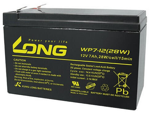 Long 12V 7Ah 28W WP7-12 nagyáramú zselés akkumulátor Súly:2,1kg Csatlakozó típusa F2 széles saruFelhasználási terület: szünetmentes tápegység, riasztók, lámpák stb.