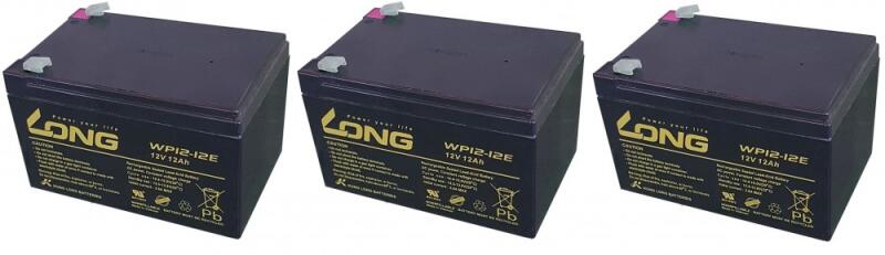 36V 12Ah Long (3db 12V 12Ah) WP12-12E típusjelölésű elektromos kerékpárba ciklikus zselés akkumulátor csúszósaru csatlakozási lehetőséggel. Méret: (H)151mm x (Sz)100,2mm x (M)100,4mm saruval 104,6mm. Súly: 4,51kg/db. Várható élettartam 5 év (3 órás kisütésnél, 25°C-on) Felhasználási terület: elektromos meghajtású autó, elektromos kerékpár, e-bike, golfkocsi, kerekesszék, rokkantkocsi... stb.
