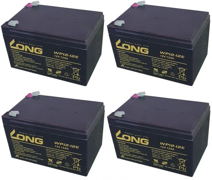 48V 12Ah Long (4db 12V 12Ah) WP12-12E típusjelölésű elektromos kerékpárba ciklikus zselés akkumulátor csúszósaru csatlakozási lehetőséggel. Méret: (H)151mm x (Sz)100,2mm x (M)100,4mm saruval 104,6mm. Súly: 4,51kg/db. Várható élettartam 5 év (3 órás kisütésnél, 25°C-on) Felhasználási terület: elektromos meghajtású autó, elektromos kerékpár, e-bike, golfkocsi, kerekesszék, rokkantkocsi... stb.