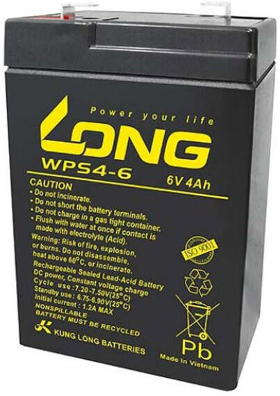 A Long WPS4-6 6V 4Ah AGM (Absorbent Glass Mat) technológiával gyártott karbantartás mentes ólomsavas zselés akkumulátor. Kiváló minőség és megbízhatóság a jellemzője. Az ólomlemezek és elektrolit megbízható tápellátást biztosítanak a legtöbb feszültségtámogatási rendszernek, például az UPS-nek vagy a vészhelyzeti áramellátásnak. Rendkívül erős teljesítmény-visszanyerő tulajdonság, alacsony önkisülési jellemző így számos pozícióba telepíthető mint pl. riasztórendszerek, távközlési berendezések, védelmi rendszerek, orvosi felszerelés... stb.