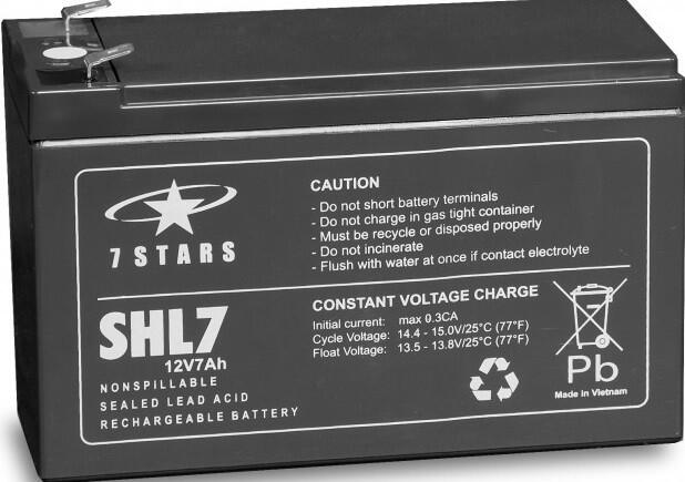 A 7 Stars SHL7-12 egy 12V-os, 7Ah kapacitású zárt ólom-savas (VRLA) akkumulátor, amelyet széles körben használnak szünetmentes tápegységekhez (UPS), riasztórendszerekhez, vészvilágításhoz, és más kis- és közepes energiaigényű alkalmazásokhoz. Főbb specifikációk :