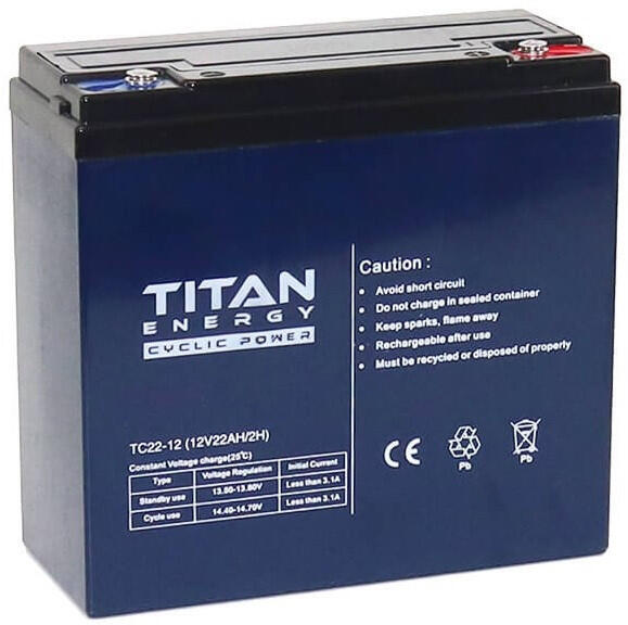 12V 22Ah TitanEnergy TC22-12 6-DZM-20 vagy 6-DZF-20 elektromos kerékpárba ciklikus zselés akkumulátor csavaros csatlakozással. Méret:(H)181mm x (Sz)76mm x (M)167mm Súly:6.2kg Garancia 12 hónap + 12 hónap jótállási idő. Várható élettartam 5 év (20 órás kisütésnél, 25°C-on). Felhasználási terület: elektromos kerékpár, e-bike, elektromos meghajtású autó, golfkocsi, kerekesszék, rokkantkocsi, tricikli... stb.