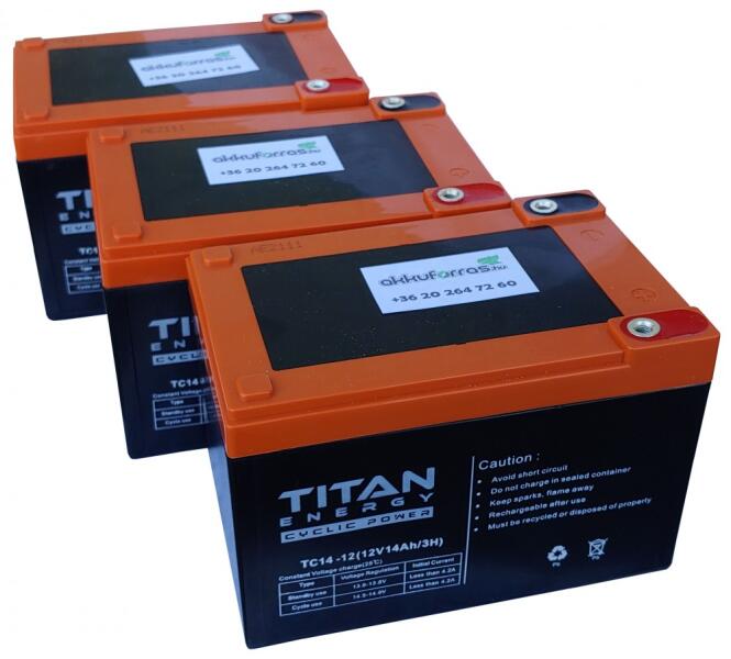 36V 14Ah TitanEnergy TC14-12 (3db 12V 14Ah) 6-DZM-12/6-DZF-12 vagy 6-DZM-14 típusjelölésű elektromos kerékpárba ciklikus zselés akkumulátor csavaros csatlakozási lehetőséggel. Méret: (H)151mm x (Sz)100,2mm x (M)100,4mm csavarral 104,6mm. Súly: 4,51kg/db. Várható élettartam 5 év (3 órás kisütésnél, 25°C-on) Felhasználási terület: elektromos meghajtású autó, elektromos kerékpár, e-bike, golfkocsi, kerekesszék, rokkantkocsi... stb.