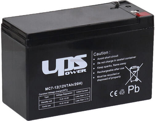 UPS Power 12V 7Ah zselés akkumulátor MC7-12 Az UPS Power 12V 7Ah zselés akkumulátor MC7-12 a leggyakrabban használt zselés akkumulátortípus. Ez a modell kiváló ár-érték arányával és megbízhatóságával egyaránt kiemelkedik a hasonló termékek közül. A zselés technológia lehetővé teszi, hogy hosszabb élettartammal és jobb teljesítménnyel rendelkezzen, mint a hagyományos ólomsavas akkumulátorok. Remek megoldást jelent a biztonságtechnika terén, de vészvilágítás, orvosi eszközök vagy játékok üzemeltetésére is alkalmas. Keskeny csatlakozója miatt szünetmentes tápegységekhez nem használatos. Biztonságtechnika terén verhetetlen az UPS Power 12V 7Ah zselés akkumulátor MC7-12 Az F2 Faston 4,8 mm vékony saruval ellátott csatlakozójú UPS Power MC7-12 modellnek leginkább a biztonságtechnika területén történő felhasználása a jellemző. A leggyakrabban tűzjelző berendezések, beléptető rendszerek vagy riasztók esetében alkalmazzák. Ez a zselés akkumulátor minden olyan riasztóközpontban és kültéri hangjelzőben telepíthető, ahol az akkumulátor méretét a gyártó támogatja. Hosszú élettartamának és stabil működésének köszönhetően pedig az egyik legjobb megoldást jelenti a piacon. Egyszerű beépítés, gondozásmentes használat A UPS Power MC7-12 felitatott, üvegszálas technológiával (AGM) készült savas, ólom akkumulátor. Egyszerűen beépíthető, használata során pedig nem igényel karbantartást. Kialakításának köszönhetően kis helyen is elfér, és jó megoldást jelent olyan esetekben is, amikor hosszabb tárolásra, vagy ritka használatra lehet szükség. gázrekombinációs, zárt konstrukciójának köszönhetően bármilyen helyzetben beépíthető. Az UPSPower MC7-12 -vel helyettesíthető akku típusok:
