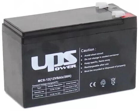 UPS Power MC9-12 12V 9Ah széles sarus zselés akkumulátor Súlya: 2,47kg Felhasználási területei: szünetmentes tápegységek, riasztó rendszerek stb.
