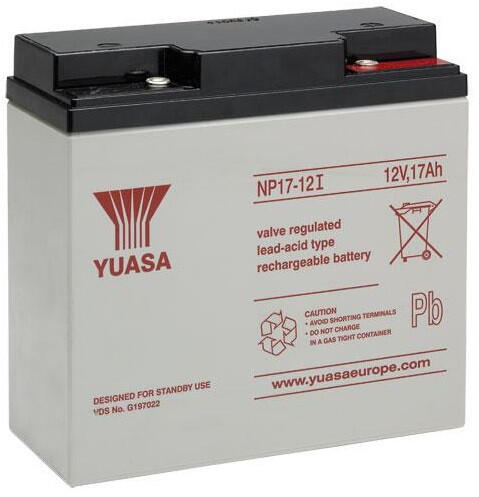 12 V 17Ah YUASA NP17-12 zárt gondozásmentes AGM technológiás, szeleppel vezérelt VRLA zselés ólomsavas akkumulátor. VdS minősítés (VdS No: G 189099) mely egy modern, csúcstechnológiájú energiatároló akkumulátor általános célú, ismételten újratölthető használatra. A szigetelt tömítéssel vízszintes, függőleges és oldalsó irányban is elhelyezhető, biztonságát és funkcióit ez nem befolyásolja. Várható élettartama 3-5 év (Standby - Készenléti üzemmódban 5 év, 20 ⁰C), mely nagyban függ a környezeti hőmérséklettől, felhasználási területtől, terheléstől.
