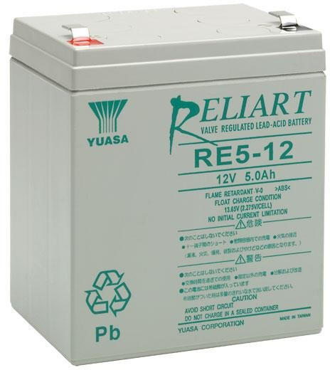 RE5-12FR 12V/5Ah - tartalék áramforrás, gondozásmentes, VRLA, teljesen zárt YUASA márkájú zselés akkumulátor ciklikus alkalmazásokhoz. AGM technológia. Szünetmentesekhez, riasztókhoz, tűzvédelmi eszközökhöz, ciklikus használatra. A RE sorozatú YUASA akkumulátorokat a legszélesebb körű alkalmazásokhoz tervezték (készenléti és alacsonyabb terhelésű ciklikusos alkalmazásokhoz). Eurobat szerinti élettartamuk - általános célú használat esetén 6-9 év. Lángálló dobozban. A YUASA akkumulátorok karbantartást nem igényelnek , teljesen zártak és bármilyen helyzetben működnek.