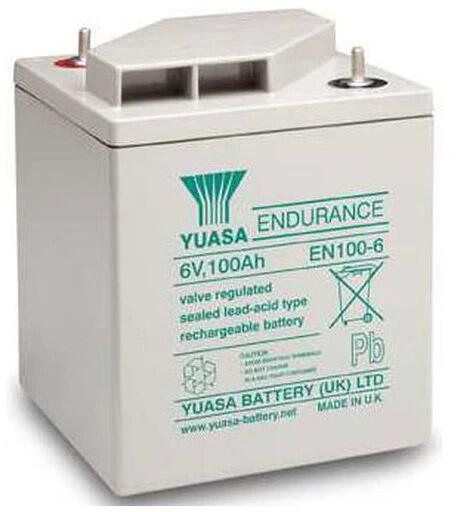 A Yuasa EN100-6 egy 6V-os, 100Ah kapacitású, gondozásmentes, zárt ólom-savas (VRLA) akkumulátor, amelyet kifejezetten szünetmentes tápegységekhez (UPS), telekommunikációs eszközökhöz és vészvilágításhoz terveztek. Az AGM (Absorbent Glass Mat) technológiának köszönhetően nincs benne szabad sav, így bármilyen helyzetben telepíthető és működtethető, akár 90°-os szögben is az eredeti helyzetéhez képest. Főbb műszaki adatok: