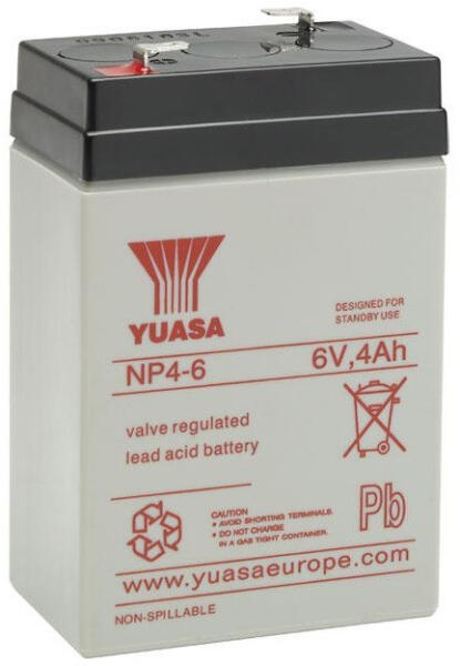 6V 4Ah YUASA NP4-6 zárt gondozásmentes AGM technológiás, szeleppel vezérelt VRLA zselés ólomsavas akkumulátor. VdS minősítés (VdS No: G 189099) mely egy modern, csúcstechnológiájú energiatároló akkumulátor általános célú, ismételten újratölthető használatra. A szigetelt tömítéssel vízszintes, függőleges és oldalsó irányban is elhelyezhető, biztonságát és funkcióit ez nem befolyásolja. Várható élettartama 3-5 év (Standby - Készenléti üzemmódban 5 év, 20 ⁰C), mely nagyban függ a környezeti hőmérséklettől, felhasználási területtől, terheléstől.