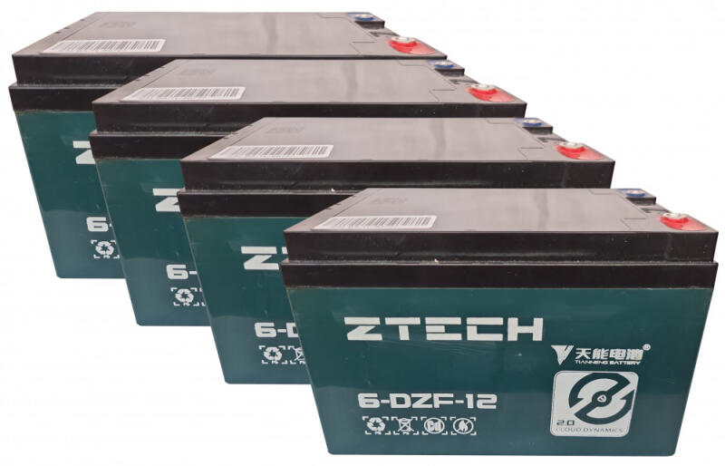 48V 12Ah ZTECH 6-DZF-12 (4db 12V 12Ah) vagy 6-DZM-12 típusjelölésű elektromos kerékpárba ciklikus zselés akkumulátor csavaros csatlakozási lehetőséggel. Méret: (H)151mm x (Sz)100,2mm x (M)100,4mm csavarral 104,6mm. Súly: 4,51kg/db. Várható élettartam 5 év (3 órás kisütésnél, 25°C-on) Felhasználási terület: elektromos meghajtású autó, elektromos kerékpár, e-bike, golfkocsi, kerekesszék, rokkantkocsi... stb.